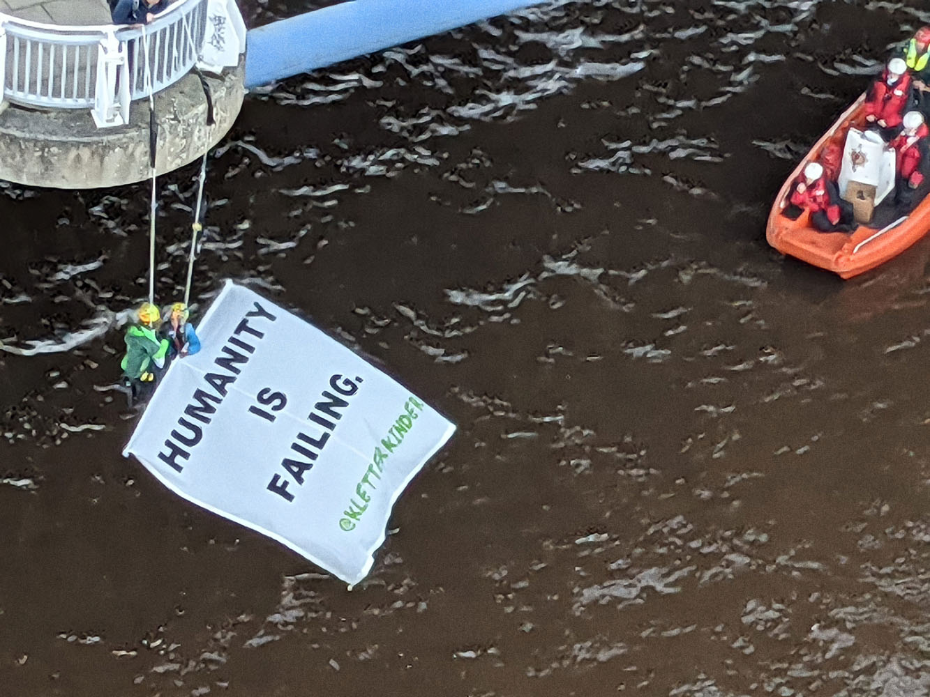 Just moments after arriving in Glasgow, I saw two protestors hanging off the city’s Squinty Bridge, carrying a sign that said humanity is failing..